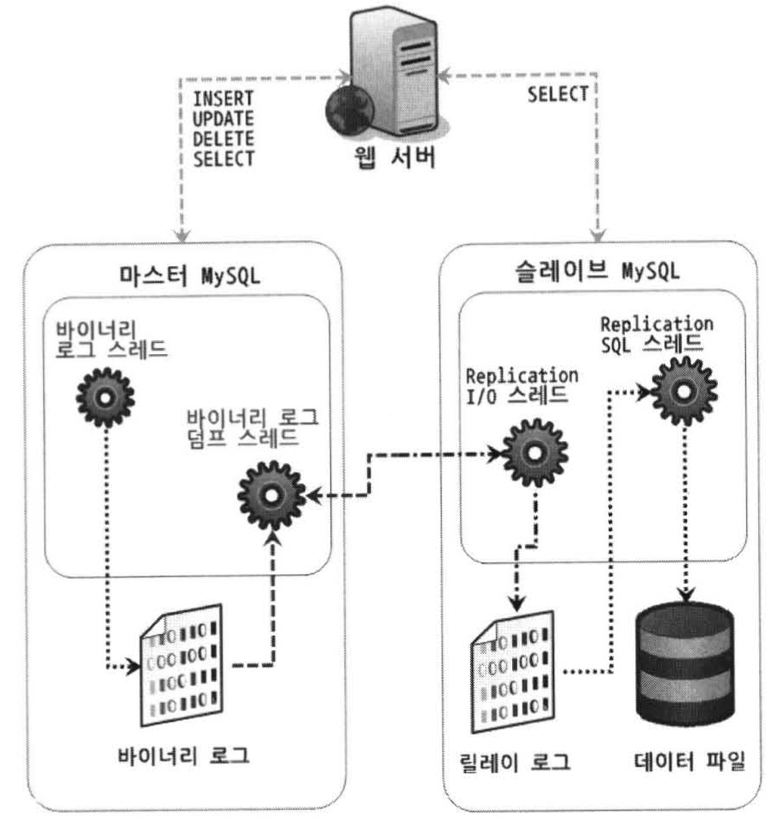 * 복제 흐름 : Master에서 실행되는 DML, DDL 중 데이터의 구조/내용을 변경하는 모든 쿼리 문장을 Binlog 에 기록하고, Slave에서 변경 내역을 요청하면 Master가 Binlog를 읽어 Slave로 넘긴다.