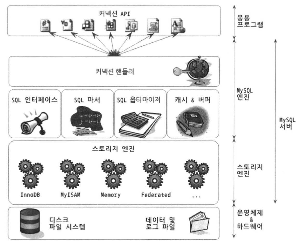 * MySQL 엔진 : 요청된 SQL 문장을 분석하거나 최적화하는 등 DBMS의 두뇌에 해당되는 처리를 수행한다.
